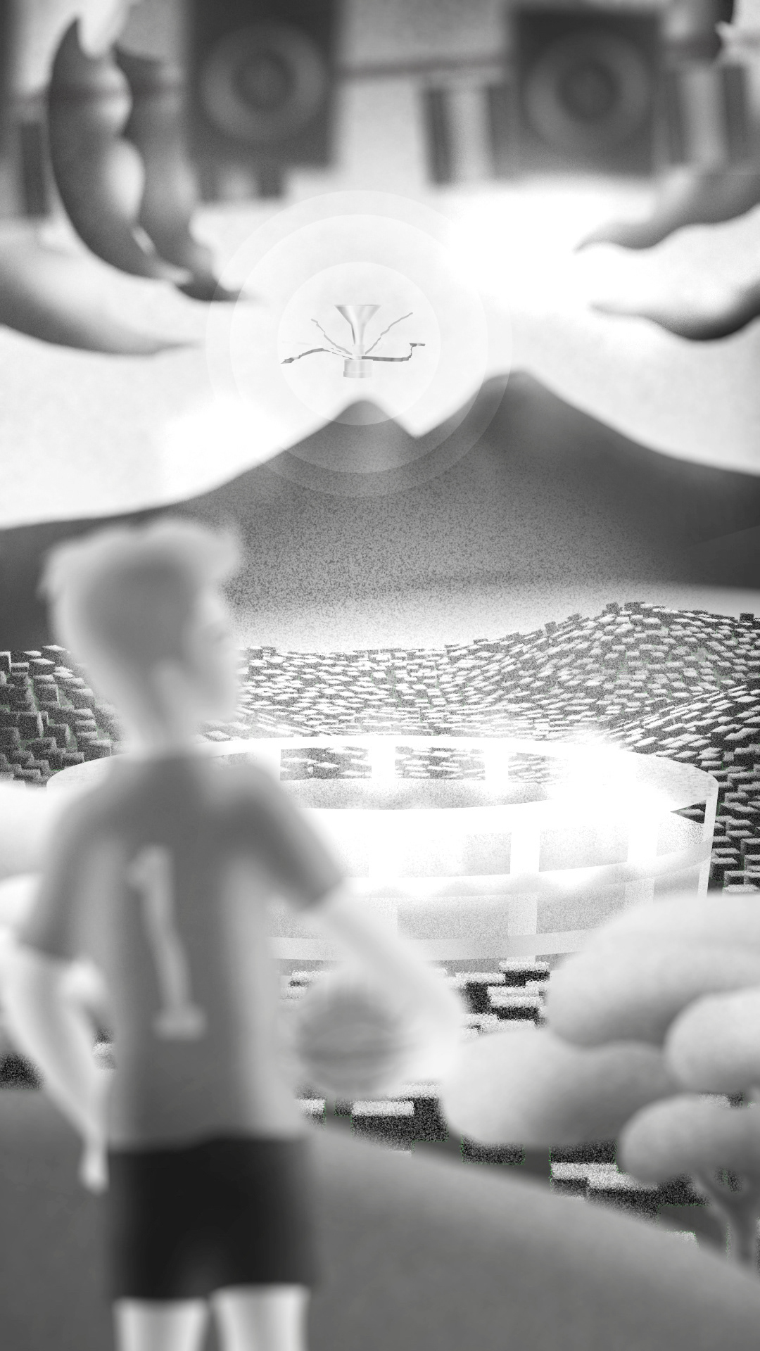 Other elements, such as the rotating trophy over the city, the ribbons on the trophy, the stadium interior including stands, fans, and grass, as well as the text package in the final cover, were modeled and animated in Maxon Cinema 4D.